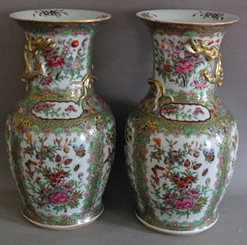 with applied dragon Decoration. Each vase has an applied dragon, chasing the celestial pearl of wisdon. Great decoration. Perfect Condition. CA 1860 13 3/4" ht by 7" in diameter at the widest point. |