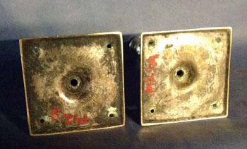 A Pair of Early Bold Saucer Base Candlesticks. Great form. The base with four holes in the corners, possibly for attachment for use on shipboard. a brass piece inserted in the socket, to reduce the size for modern candles. CA 1700-1730. 9" tall. |